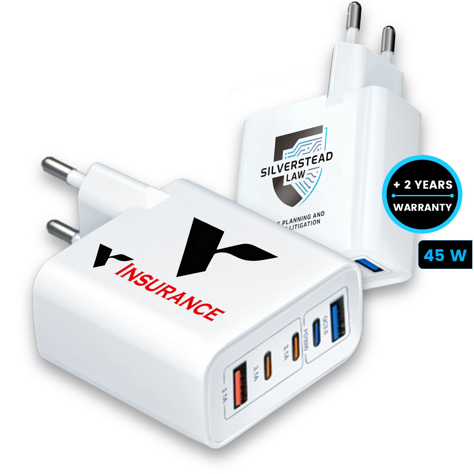 45W (total) USB adaptér do EU zásuvky s kombinací 3 × USB-C (PD 30 W) a USB-A (QC 20 W) je univerzální nabíječka pro každodenní používání doma, v kanceláři i na cestách. Umožňuje rychlé nabíjení moderních zařízení přes Power Delivery i Quick Charge a díky více portům zvládne současně dobíjet telefon, tablet, sluchátka i další elektroniku z jediné zásuvky. Kompaktní provedení s pevnou EU vidlicí šetří místo v tašce a minimalizuje potřebu dalších adaptérů. Díky čistým plochám a modernímu vzhledu je adaptér vhodný i jako firemní dárek s možností brandingu, který bude viditelný při každém nabíjení.