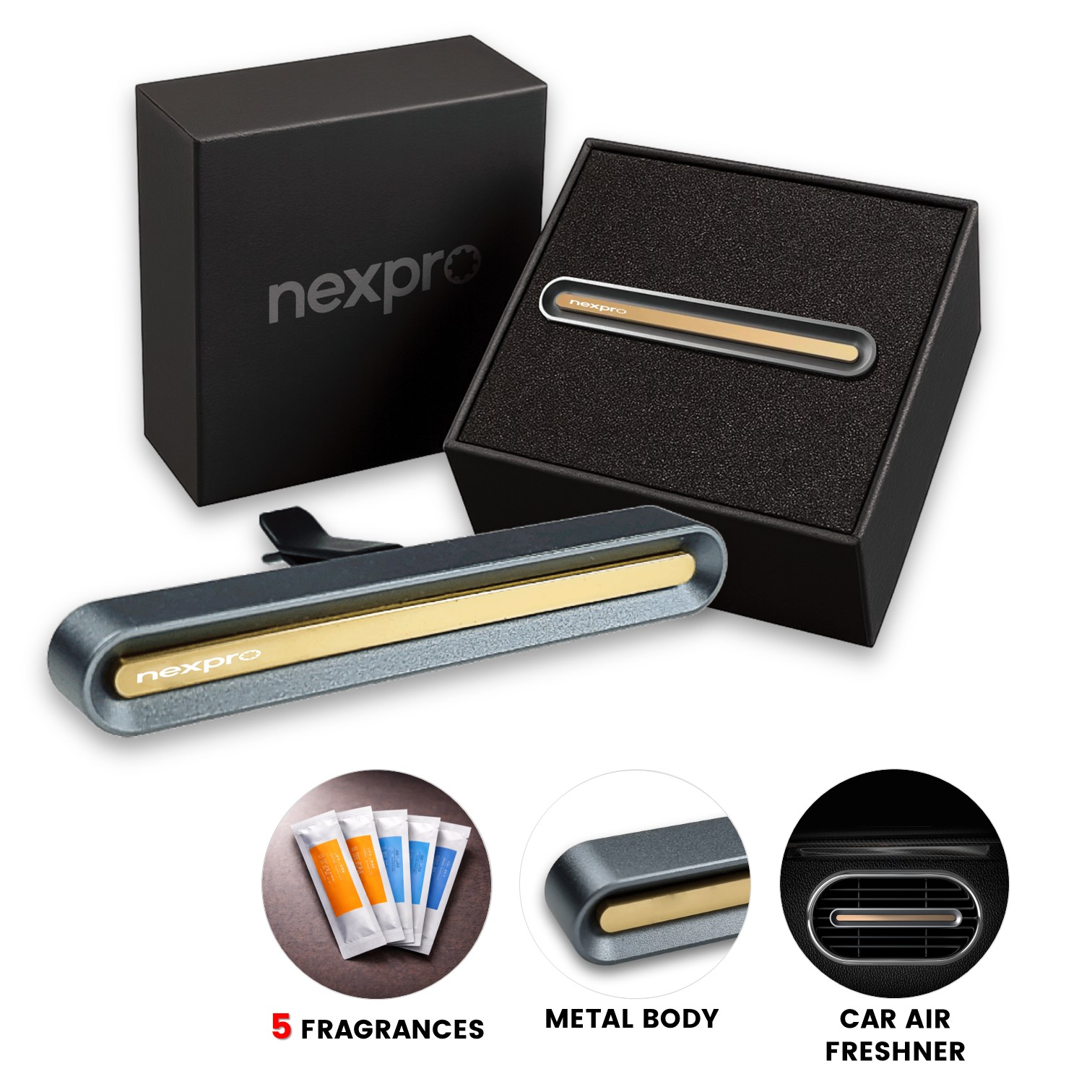 Tento designový kovový osvěžovač vzduchu do auta je elegantní doplněk, který zpříjemní každou jízdu. Jednodušese upevní do ventilační mřížky a díky výměnným náplním s 5 různými vůněmi zajistí dlouhodobou svěžest interiéru. Každá náplň vydrží několik týdnů a její výměna je rychlá a pohodlná. Celokovové provedení působí prémiově a je ideální i pro decentní branding. Praktický a reprezentativní dárek pro klienty i partnery v oblasti autodoplňků, mobility nebo služeb.