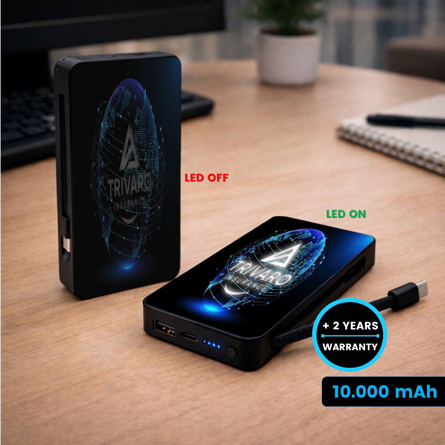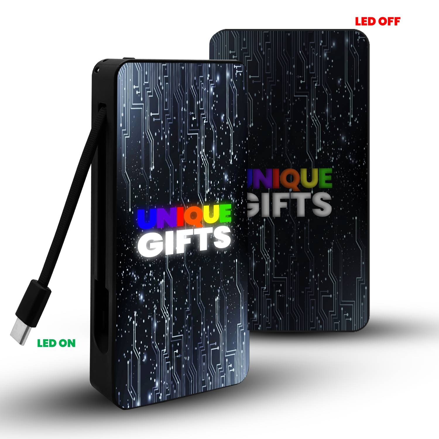 Tato kompaktní 10000mAh power banka s integrovaným USB-C kabelem nabízí spolehlivé nabíjení na cestách i při každodenním používání. Díky velké LED ploše s možností plnobarevného podsvíceného loga promění každý kus v výrazný prezentační produkt, který vynikne při každém nabíjení. Dvojitý výstup (USB-C a USB-A) umožňuje nabíjet dvě zařízení současně výkonem 5V/2A, zatímco integrovaný USB-C kabel zajistí rychlé a pohodlné doplnění energie. Tenké ABS+PC tělo je odolné, lehké a snadno se vejde do kapsy či tašky. Ideální jako moderní firemní dárek nebo elegantní doplněk na cesty — praktické řešení s vizuálně atraktivním LED logem, které upoutá pozornost při každém použití.