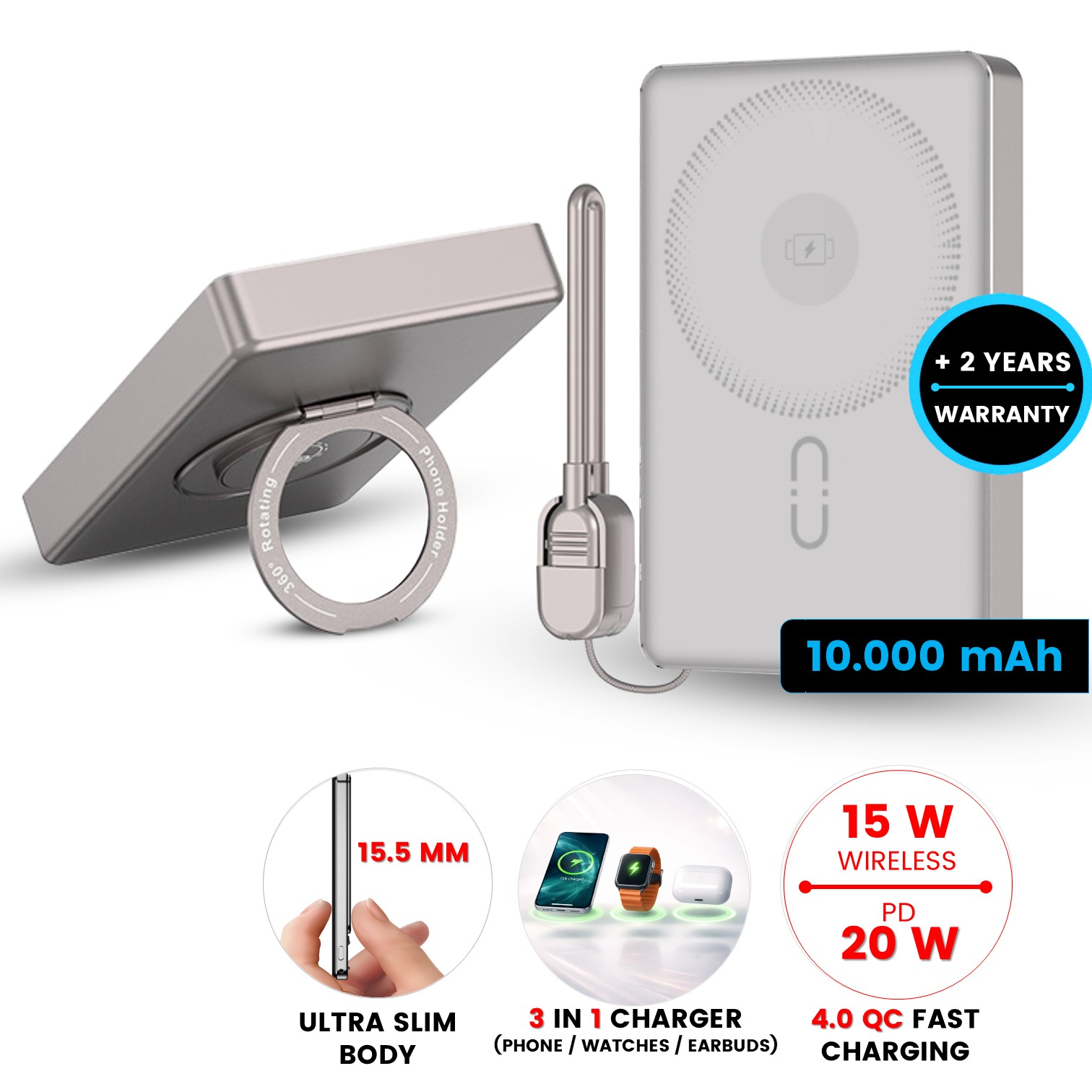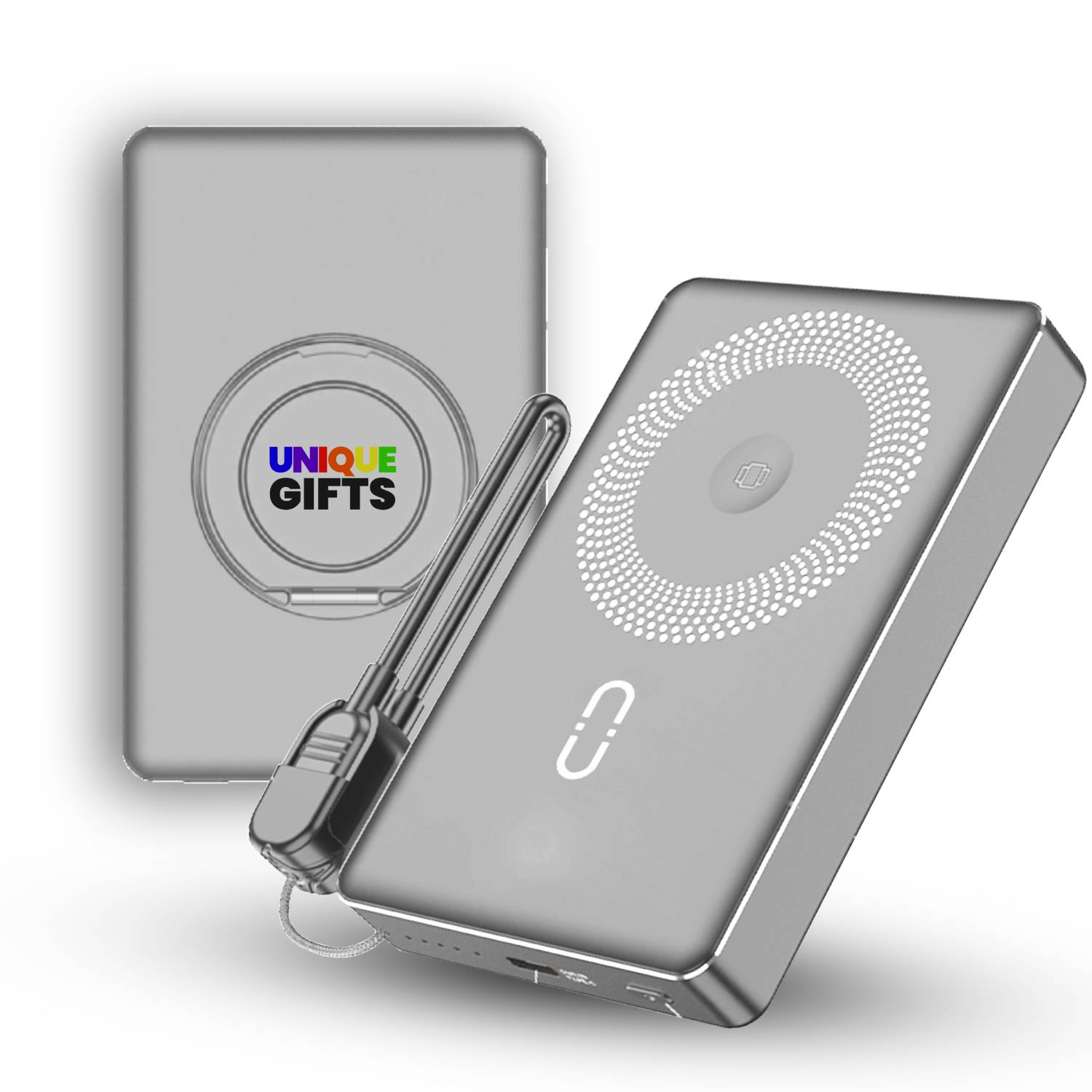 Tato 10000mAh magnetická power banka je určena pro uživatele, kteří potřebují vyšší kapacitu, spolehlivost a rychlé doplnění energie kdykoli během dne. Kvalitní Li-pol baterie třídy A poskytuje stabilní výkon a dlouhou výdrž, díky čemuž bez problémů nabijete telefon i další drobná zařízení. Power banka podporuje PD 20 W pro rychlé kabelové nabíjení a nabízí univerzální bezdrátovou nabíjecí plochu, která je kompatibilní se smartphony, sluchátky i Apple Watch. Silné magnetické uchycení drží power banku pevně připojenou k telefonu a otočný 360° stojánek umožňuje pohodlné sledování obsahu ve svislé i vodorovné poloze. Robustnější konstrukce a hliníkové provedení dodávají produktu profesionální vzhled a poskytují ideální prostor pro decentní branding. Praktická volba pro každodenní práci, cestování i dlouhé dny mimo zásuvku.