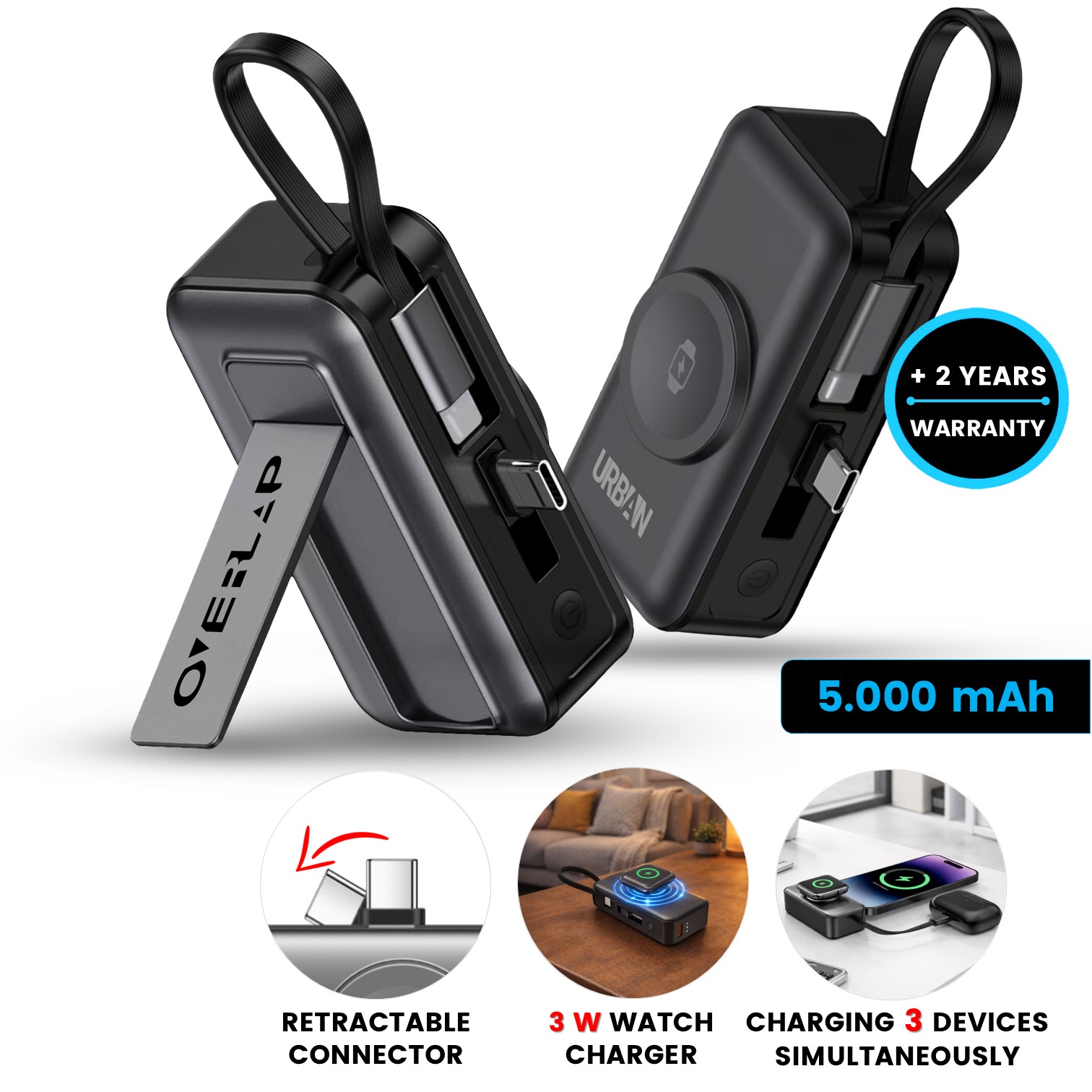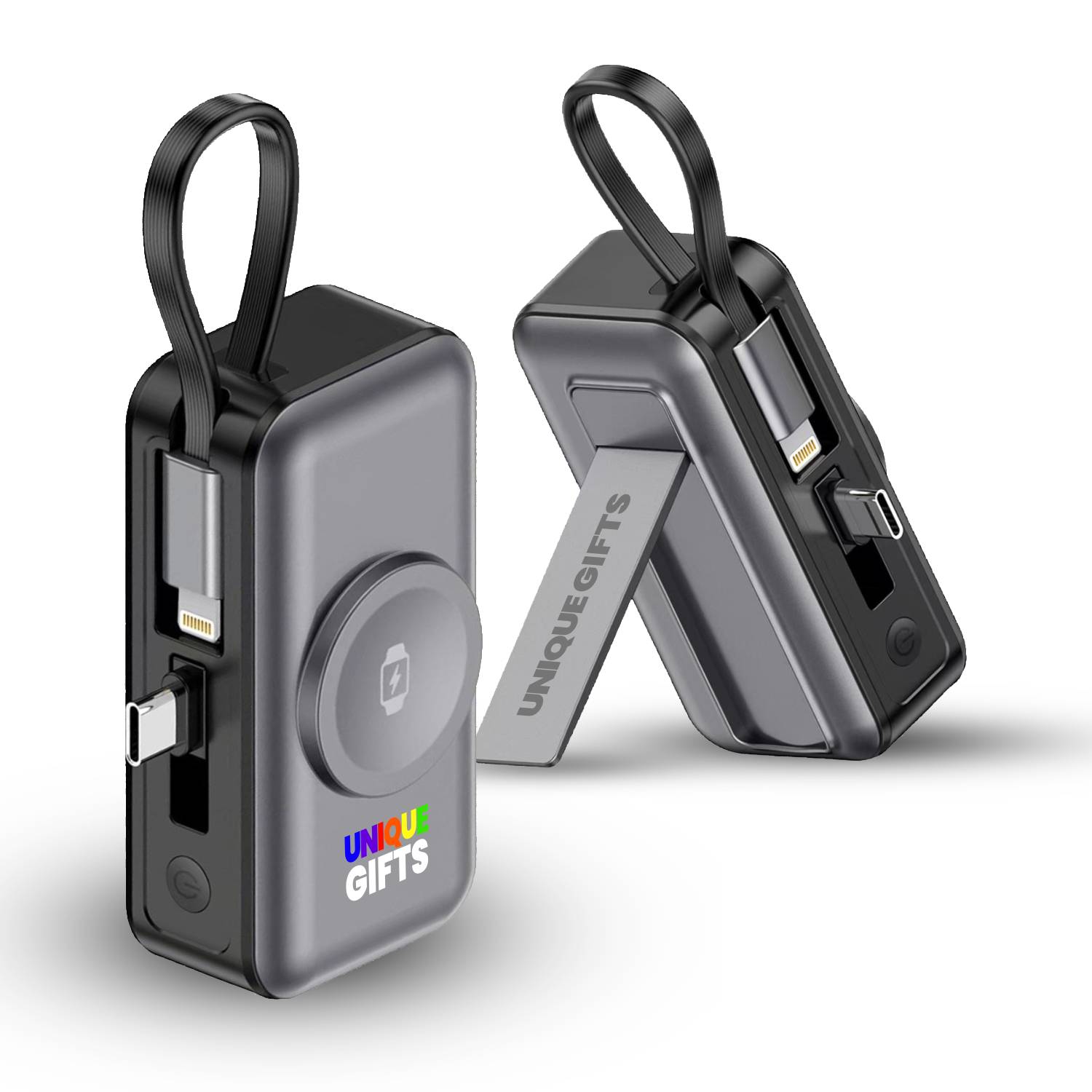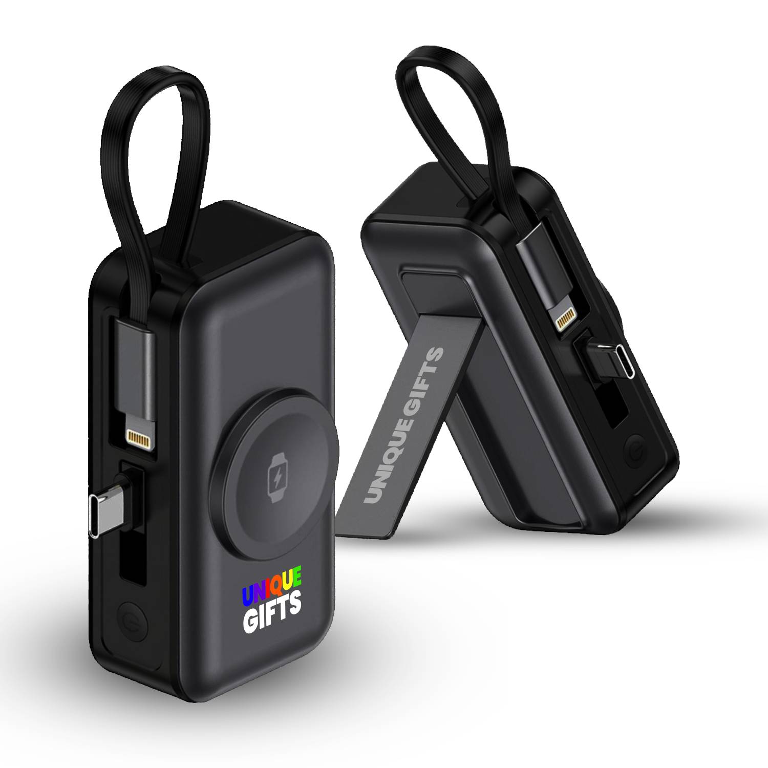 Připojitelná power banka s kapacitou 5000 mAh je chytrým řešením pro každodenní nabíjení na cestách, v práci i při cestování. Kompaktní tělo s integrovaným konektorem umožňuje přímé připojení k telefonu bez nutnosti hledat kabel, zatímco vestavěný kabel v poutku poslouží jako praktické zavěšení i záložní nabíjecí řešení. Díky rychlému nabíjení PD 20 W zvládne efektivně dobíjet moderní smartphony a současně nabízí samostatné bezdrátové nabíjení pro Apple Watch. Power banka umožňuje nabíjení až tří zařízení současně, a přesto si zachovává velmi malé rozměry, takže se snadno vejde do kapsy nebo kabelky. Elegantní design, kvalitní zpracování a možnost brandingu z ní dělají atraktivní reklamní předmět i praktický firemní dárek, který bude zákazníkům i obchodním partnerům sloužit každý den.