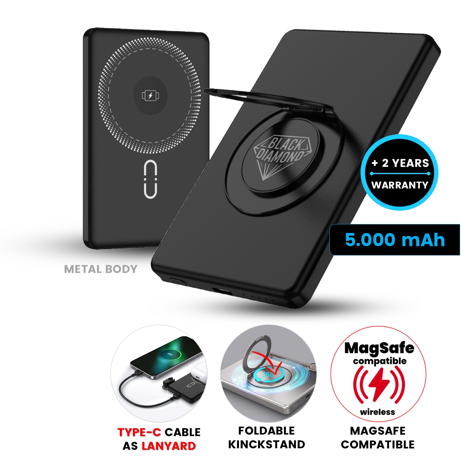 Funkce: nabíjení 3 v 1, magnetické uchycení, 360° stojánek, odnímatelný USB-C lanyard
