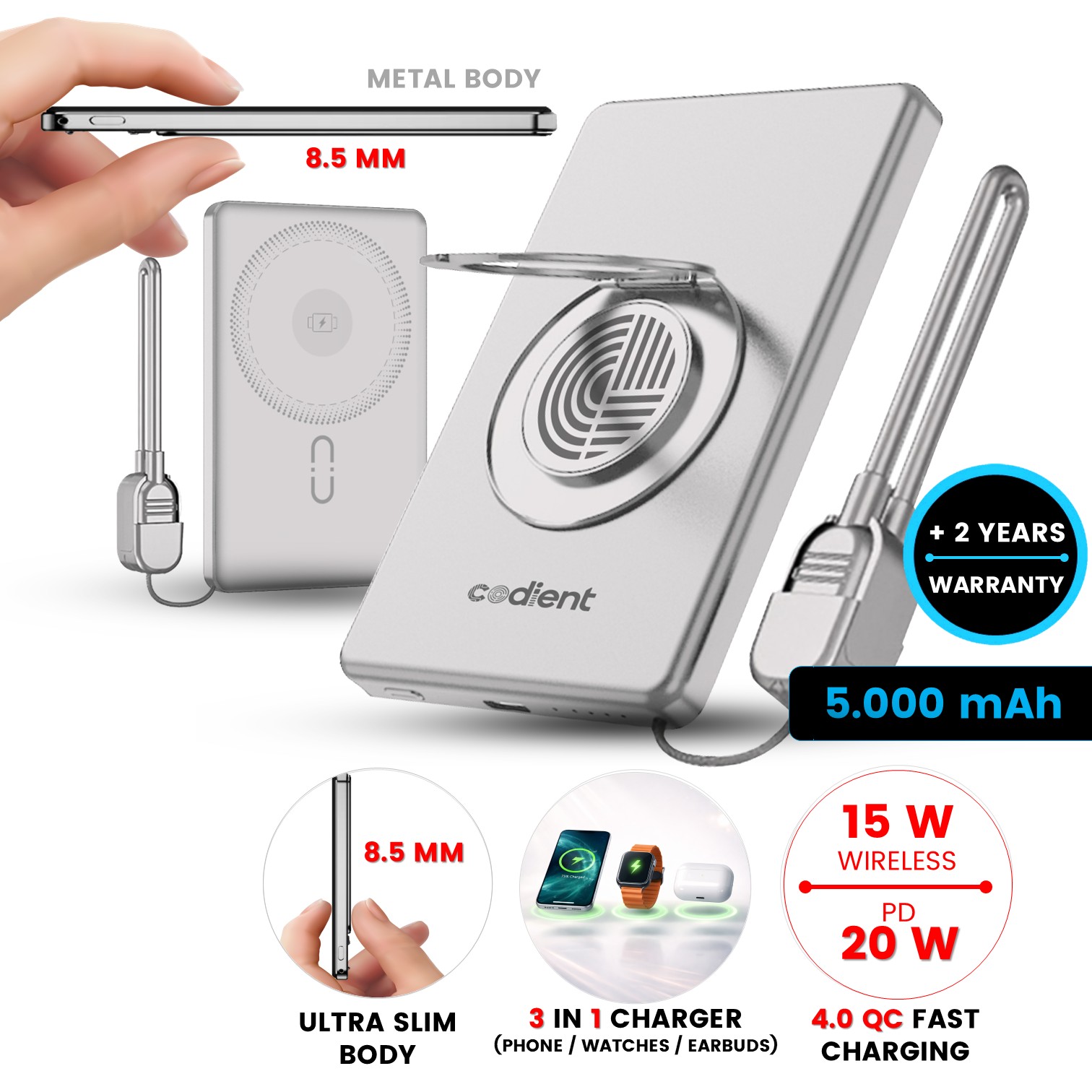Tato ultratenká 5000mAh magnetická power banka nabízí mimořádně kompaktní řešení pro rychlé nabíjení telefonu, bezdrátových sluchátek i Apple Watch. Je vybavena vysoce energeticky účinnou kobaltovou Li-ion baterií třídy A, která umožňuje extrémně tenký profil při zachování stabilního výkonu. Podpora PD20W a integrovaná bezdrátová nabíjecí plocha 3 v 1 poskytují pohodlné nabíjení bez kabelů. Silné magnetické uchycení drží power banku pevně na telefonu, zatímco 360° otočný stojánek umožňuje sledování obsahu na výšku i na šířku. Odnímatelný USB-C kabel slouží také jako praktické poutko. Prémiové hliníkové tělo nabízí prostor pro profesionální branding, který výrobek promění v elegantní firemní doplněk. Ideální pro denní použití i nabíjení na cestách.