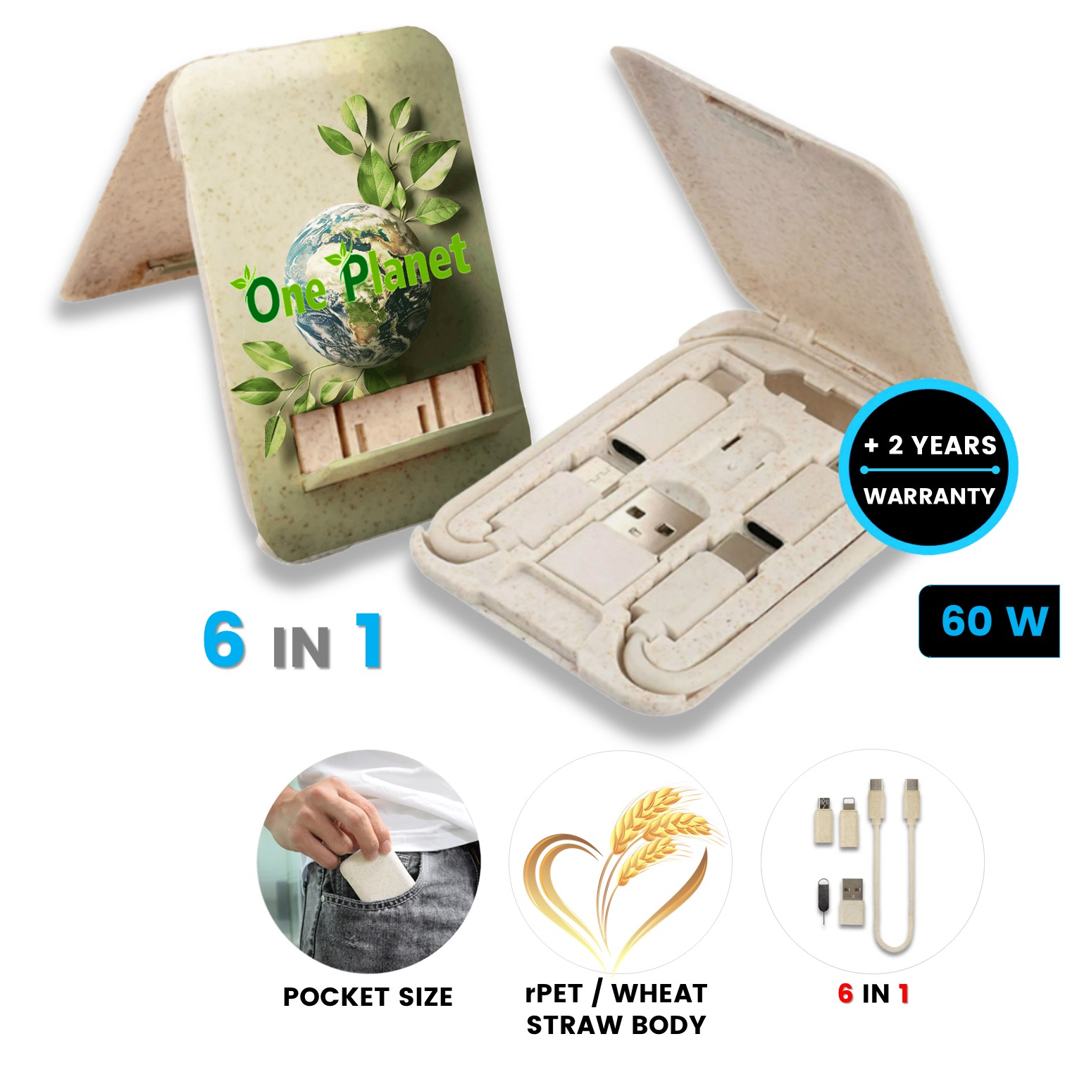 Cestovní krabička obsahuje kabel s konektory USB-C (Type-C) na obou koncích, redukci na micro USB, redukci na Lightning (iPhone), redukci na USB-A, jehlu pro otevírání slotu a místo pro SIM kartu. Krabičku můžete použít také jako praktický stojánek na mobil.