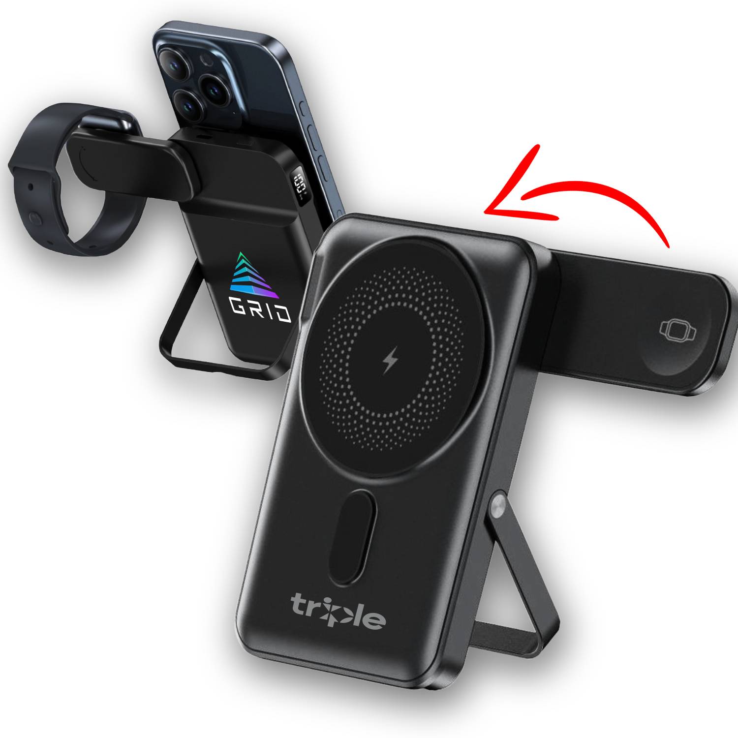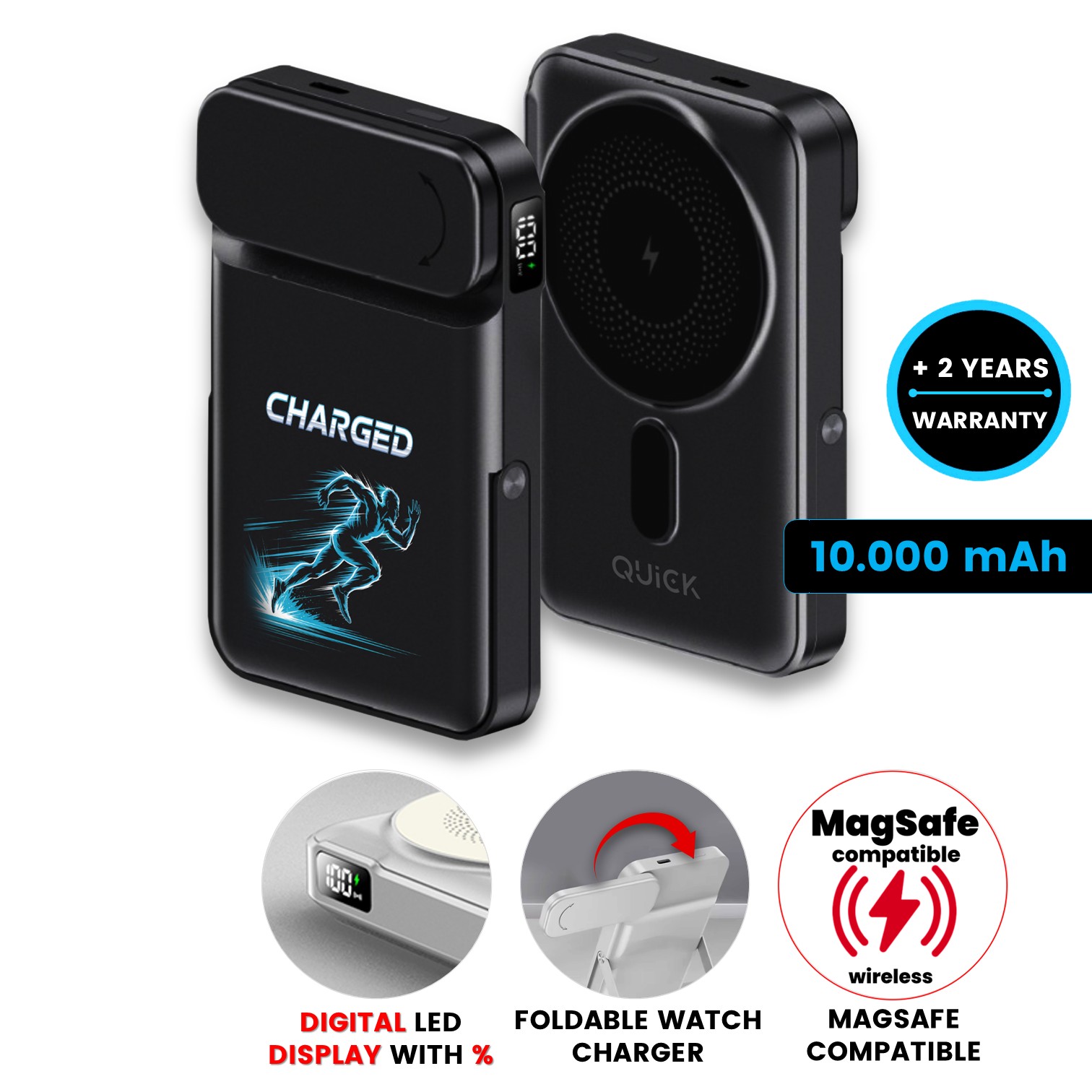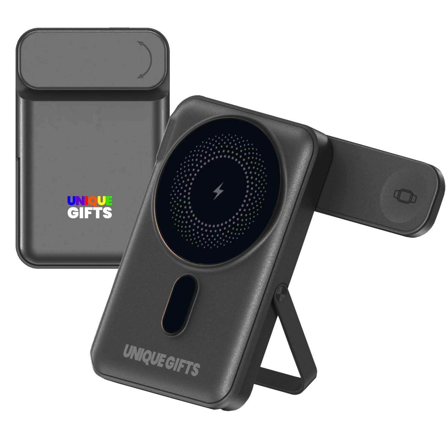 Kompaktní all-in-one řešení pro cestování i pracovní stůl: magnetická power banka s kapacitou 10000 mAh bezdrátově nabije telefon výkonem 15 W a zároveň vaše chytré hodinky na vyklápěcím modulu (max. 3 W). Silné magnetické (MagSafe) uchycení udrží iPhone a kompatibilní telefony bezpečně na místě, integrovaný stojánek promění nabíječku v praktický držák pro videohovory i sledování obsahu. Digitální displej ukazuje zbývající energii, obousměrný USB-C port s podporou rychlého nabíjení zvládá vstup i výstup (5 V / 3 A, 9 V / 2 A a 12 V / 1,67 A). Nabíjí současně telefon i hodinky a poradí si i s AirPods a jinými sluchátky s bezdrátovým nabíjením. Hladké plochy jsou ideální pro branding, takže z ní snadno uděláte prémiový firemní dárek, který je vidět při každodenním používání.