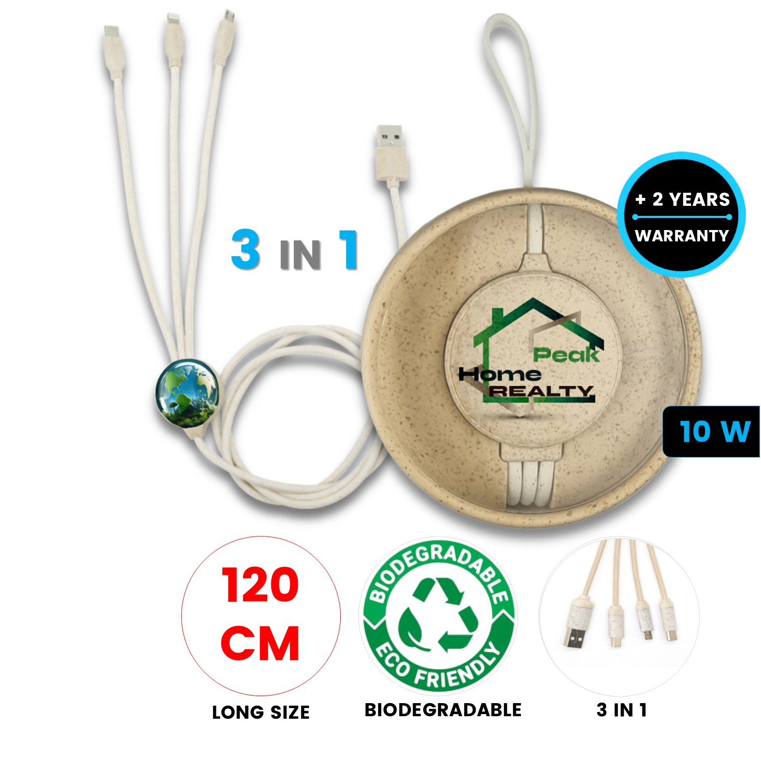 Nabíjecí kabel s konektory pro všechny typy používaných mobilních telefonů i ostatní přes USB nabíjené elektroniky je dostatečně dlouhý i robustní, aby dokázal uspokojivě rychle nabít váš mobilní telefon nebo jiné zařízení. Konstrukce kabelu se středovou částí, opatřenou rozměrnou plochou pro natištění reklamního sdělení, tvoří výborný základ pro výrazný reklamní dárek. Kabel je navíc zabalen v dekorativním pouzdru z průhledným víkem, pod kterým se výborně vyjímá právě střední kruh s reklamním potiskem. Kabel je vyroben z moderního materiálu, který nezatěžuje životní prostředí - jedná se o recyklovanou směs rostlinných zbytků a průmyslového odpadu - který je navíc i plně biodegradabilní (plně kompostovatelný / rozložitelný).