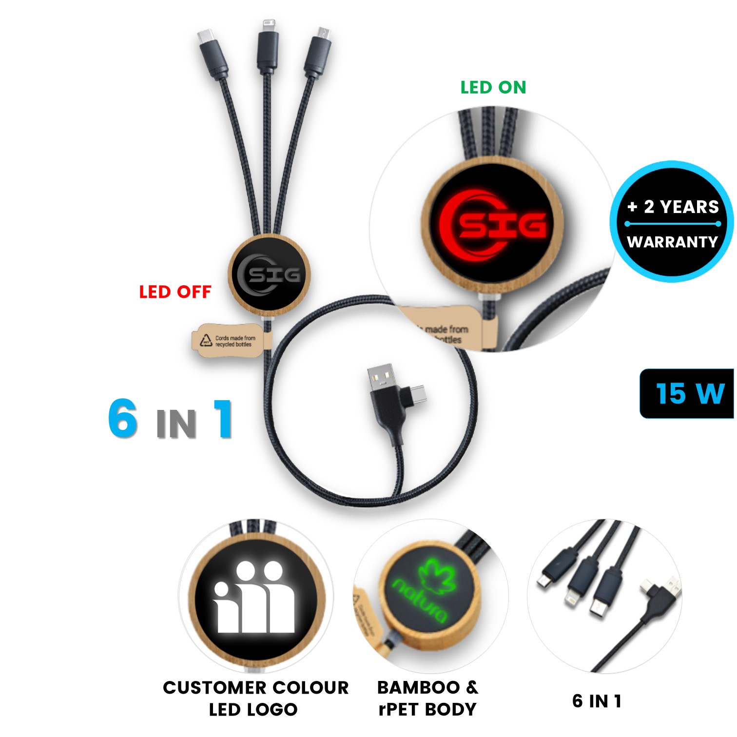 Bambusový napájecí USB kabel 6 v 1, s LED logem