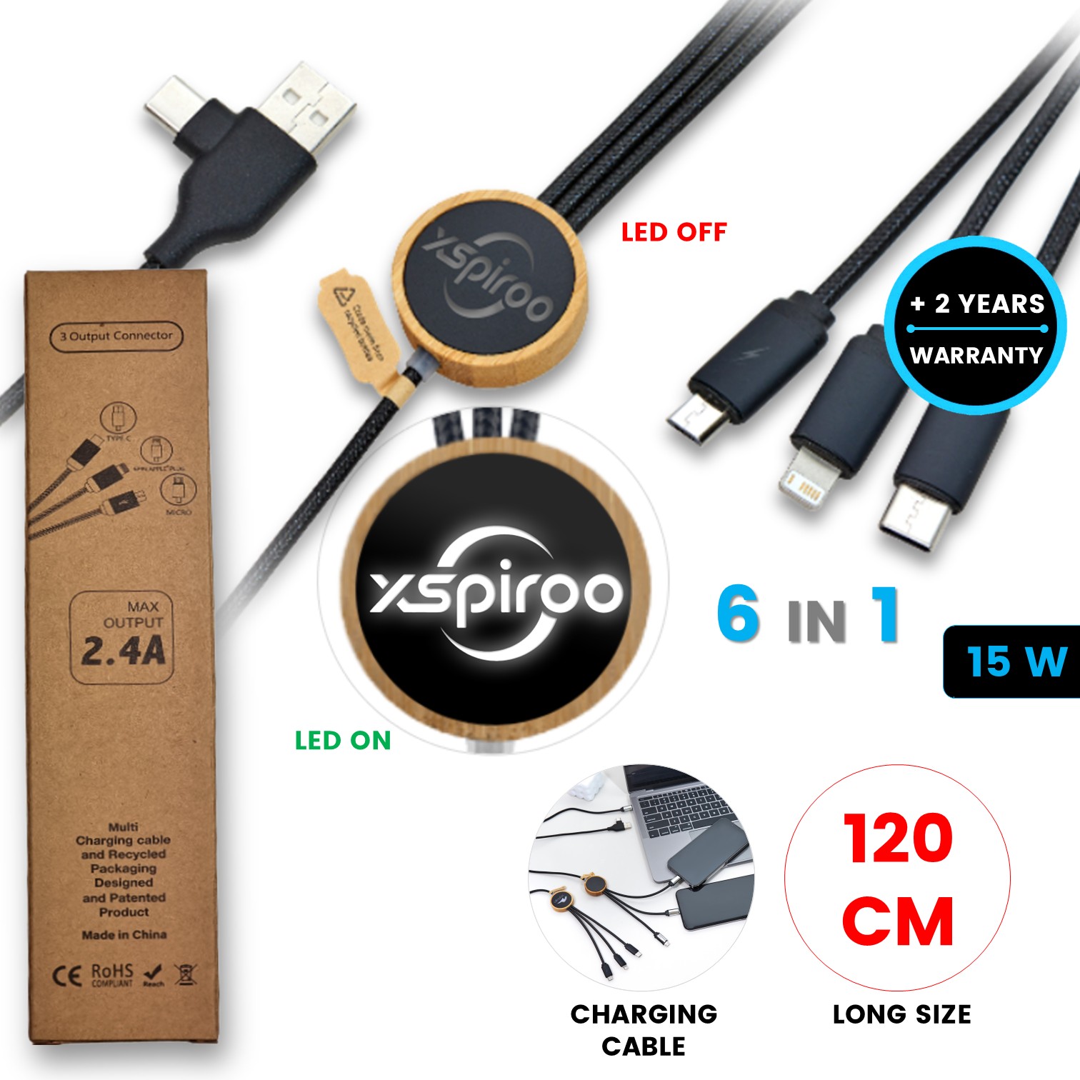 Kombinace atraktivního bambusu s odolným RPET plastem je velmi praktická. Velkou výhodou nabíjecího kabelu 6v1 je kombinovaný vstup s konektory USB-C (Type-C) a revolučním oboustranným USB-A, díky kterému si pohodlně nabijete jakékoliv přenosné zařízení, aniž byste museli neustále hledat ten správný kabel. Vše máte po ruce v rámci jednoho kompaktního zařízení. Firemní logo může zářit v podobě LED loga, případně jej lze vygravírovat laserem nebo potisknout do bambusové zadní části. Baleno v krabicce z recyklovaného papíru.