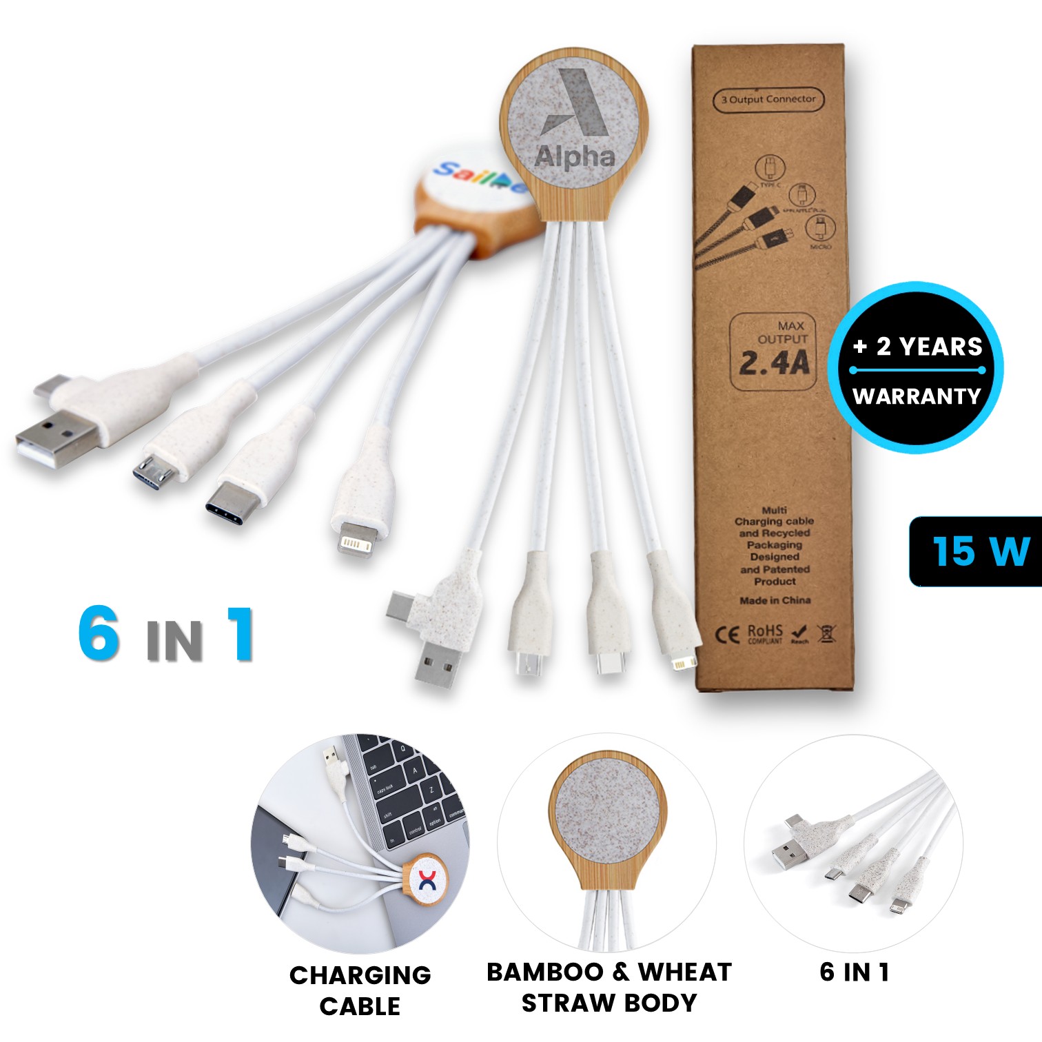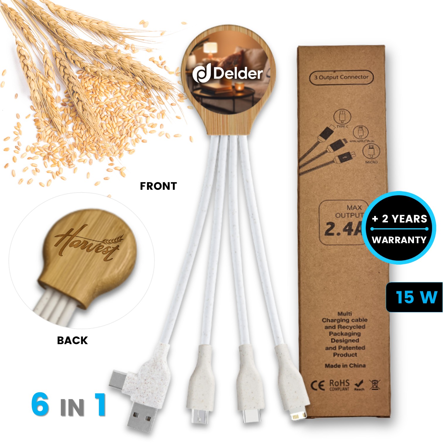 Milovníci přírodních materiálů si tento dárek oblíbí. Při výrobě tohoto nabíjecího kabelu byla využita kombinace bambusu a rozložitelného plastu s ABS (kukuřičná a obilná sláma s ABS). Kabel je dodáván v dárkovém boxu z recyklovaného papíru. Multifunkční nabíjecí kabel nabízí 6 různých kombinací propojení USB konektorů v jednom svazku. Jednoduše si vyberete tu správnou kombinaci konektorů pro nabití vašeho přenosného zařízení. Volitelně je také možné přidat kovový závěs a přidat firemní logo.