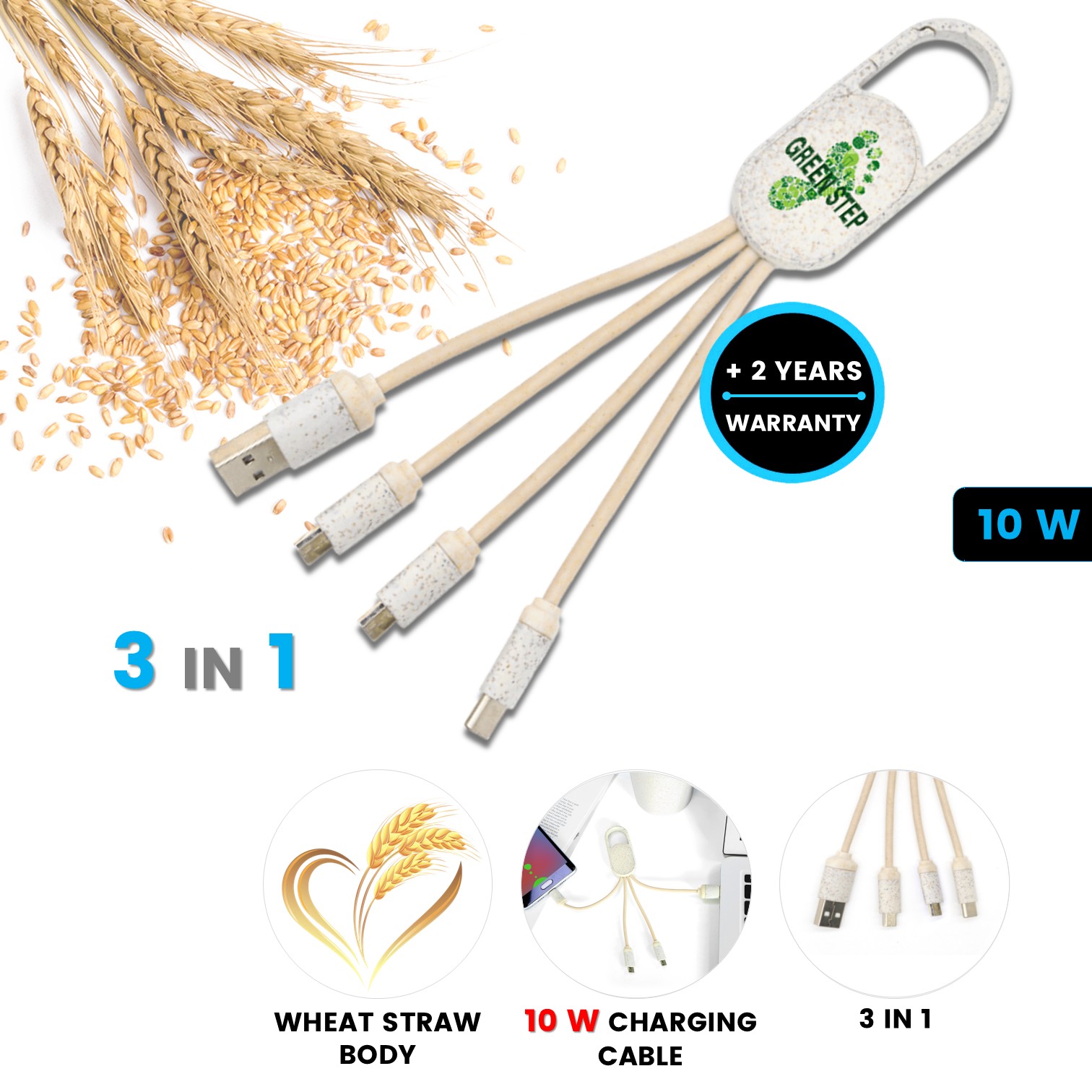 Snadno přenosný nabíjecí kabel se všemi potřebnými vstupními konektory můžete nosit snadno s sebou, díky karabině jej můžete zavěsit ke svazku klíčů, nebo připnout k tašce či batohu. Je vyroben ze změsi biologicky rozložitelných materiálů, takže nepřispívá ke zvyšování množství plastového odpadu. Na středovou část lze natisknout reklamní sdělení a tak získáte výborný ekologicky šetrný reklamní dárek.