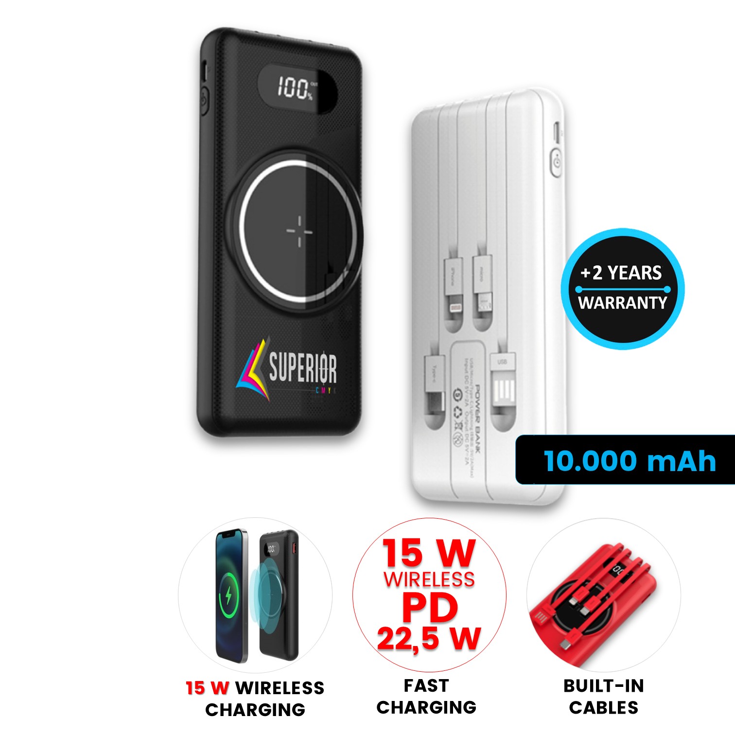 Výkonná a elegantní včetně všeho, co k efektivnímu nabíjení na cestách potřebujete. Tato powerbanka s all-in 1 vestavěnými kabely má v sobě zabudované konektory pro nabíjení USB-C (Type-C), Lightning a micro USB včetně vstupního USB-A kabelu. Tato powerbanka navíc skrývá možnost bezdrátového rychlého nabíjení pro všechny, kteří vlastní telefon s podporou Qi standardu. Stačí mít u sebe nabitou powerbanku a máte dostatek kapacity pro nabíjení kdekoliv na cestách. Power Delivery 22,5 W rychlé nabíjení ocení každý, kdo nechce čekat moc dlouho. LED displej zobrazuje aktuální kapacitu baterie a upozorní vás, kdy je potřeba powerbanku dobít.