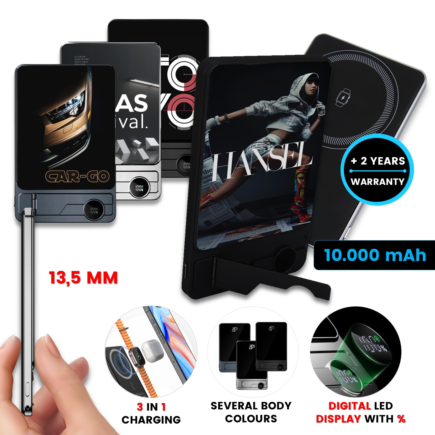 Nechte kabely doma a nabijte vše, co potřebujete – elegantně, rychle a stylově. Power banka QUANTUM nabízí bezdrátové nabíjení o výkonu 15 W, podporu PD 20 W přes USB-C a ultratenké hliníkové tělo, které perfektně přilne k telefonu díky silným magnetům. Integrovaný kovový stojánek umožní pohodlné sledování videí či videohovory, zatímco digitální displej vás informuje o stavu baterie. Díky obousměrnému napájení zvládne QUANTUM současně nabíjet i sama čerpat energii, a to bez kompromisů. Ideální pro uživatele iPhonů, Apple Watch nebo bezdrátových sluchátek. Nabízí výkon, praktičnost i prostor pro branding v dokonale kompaktním designu.