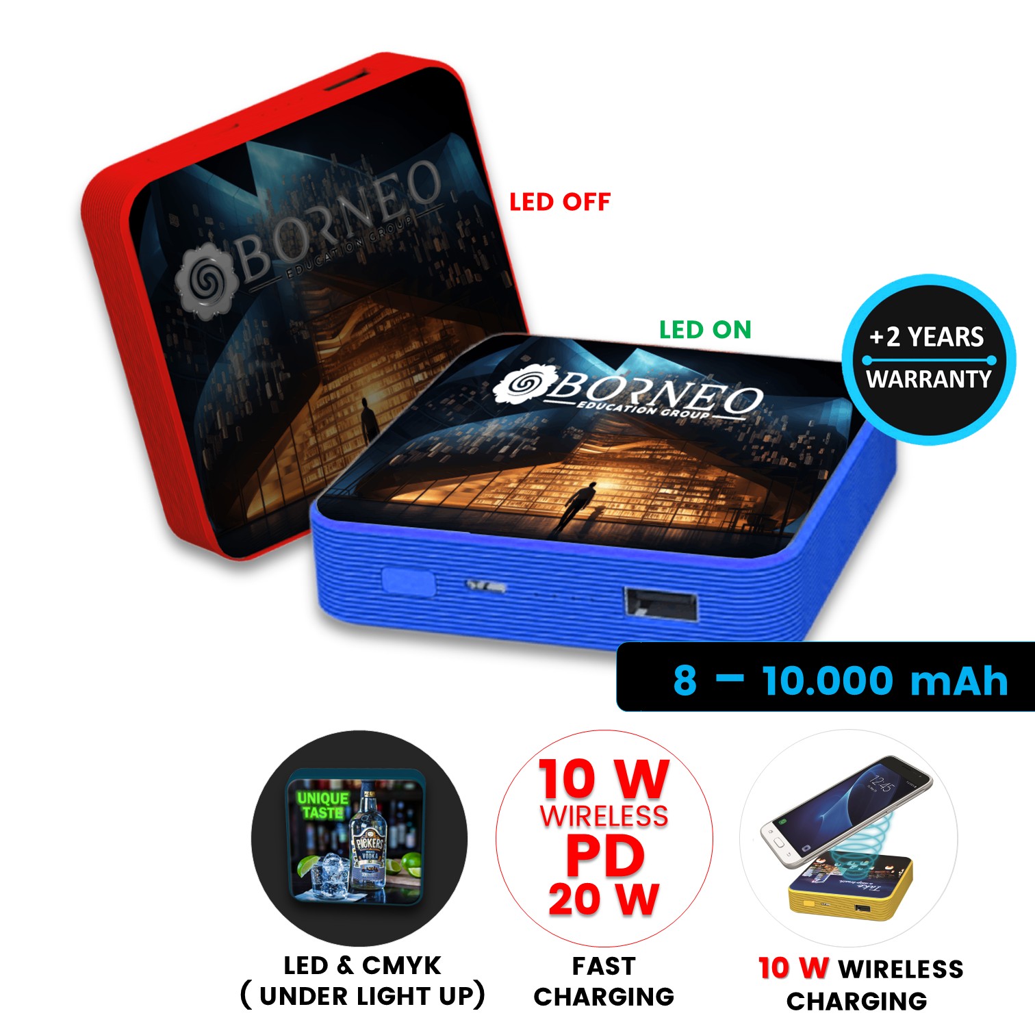 Praktická bezdrátová power banka s USB výstupem a rychlým (10W) bezdrátovým nabíjením je praktickým vybavením pro položení na stůl či nošení v tašce. Výhodou této power banky ve čtvercovém tvaru je možnost bezdrátového nabíjení pomocí magnetické indukce. Bezdrátový indukční výstup má výkon 10 W, proto dokáže plně uspokojit i telefony se standardem rychlého nabíjení QC. V případě, že váš telefon nemá funkci Qi nabíjení, je možné doplnit jej externím Qi přijímačem. Pro klasický způsob nabíjení pomocí kabelu jsou k dispozici jednak 5 V USB-A výstupy nebo USB-C (Type-C) výstup, který dává dostatečný výkon pro nabíjecí standard Power Delivery 20W. Široká paleta výstupů a podporovaných nabíjecích standardů činí tuto powerbanku moderním, avšak stále univerzálním dárkem pro každého. Na první pohled upoutá LED podsvícení, které perfektně zvýrazní vaše logo vytvořené reliéfním celoplošným CMYK potiskem. Na výběr máte z nekonečného množství barev, protože power banku dodáváme ve vlastní barvě z palety Pantone již od 50 kusů! Tuto power bankou můžeme doplnit luxusní transparentní krabičkou a nechat tak jedinečnou grafiku vyniknout již v balení.