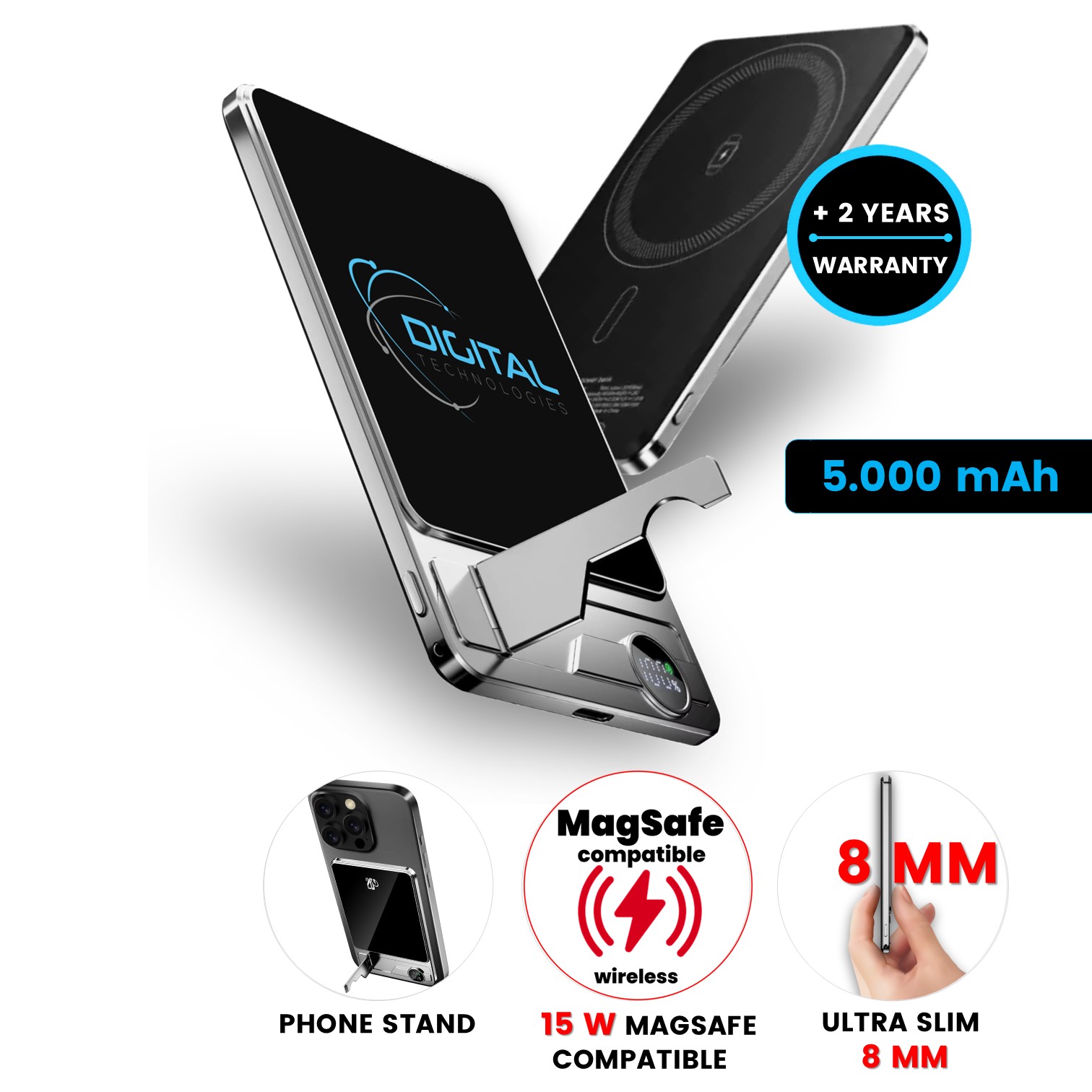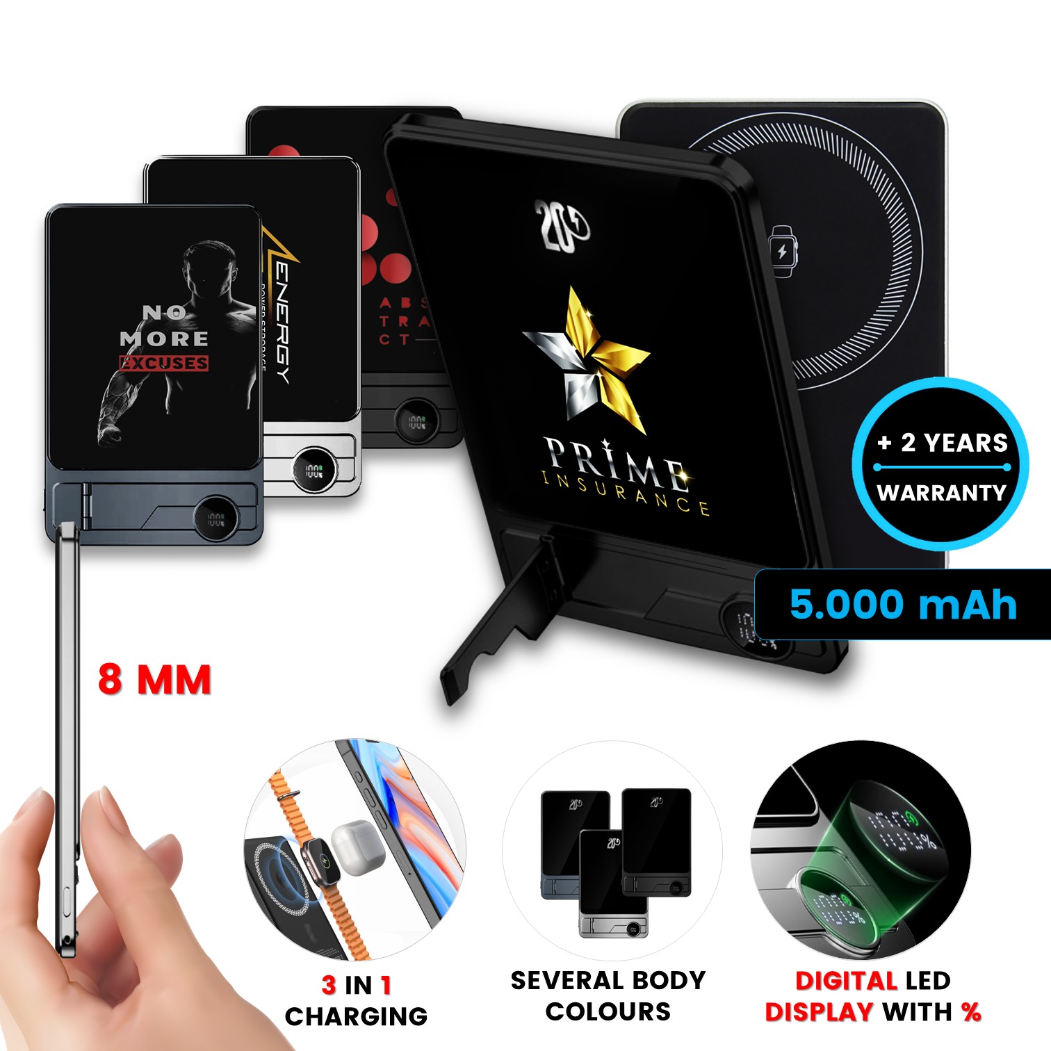 Nechte kabely doma a nabijte vše, co potřebujete – elegantně, rychle a stylově. Power banka QUANTUM nabízí bezdrátové nabíjení o výkonu 15 W, podporu PD 20 W přes USB-C a ultratenké hliníkové tělo, které perfektně přilne k telefonu díky silným magnetům. Integrovaný kovový stojánek umožní pohodlné sledování videí či videohovory, zatímco digitální displej vás informuje o stavu baterie. Díky obousměrnému napájení zvládne QUANTUM současně nabíjet i sama čerpat energii, a to bez kompromisů. Ideální pro uživatele iPhonů, Apple Watch nebo bezdrátových sluchátek. Nabízí výkon, praktičnost i prostor pro branding v dokonale kompaktním designu.